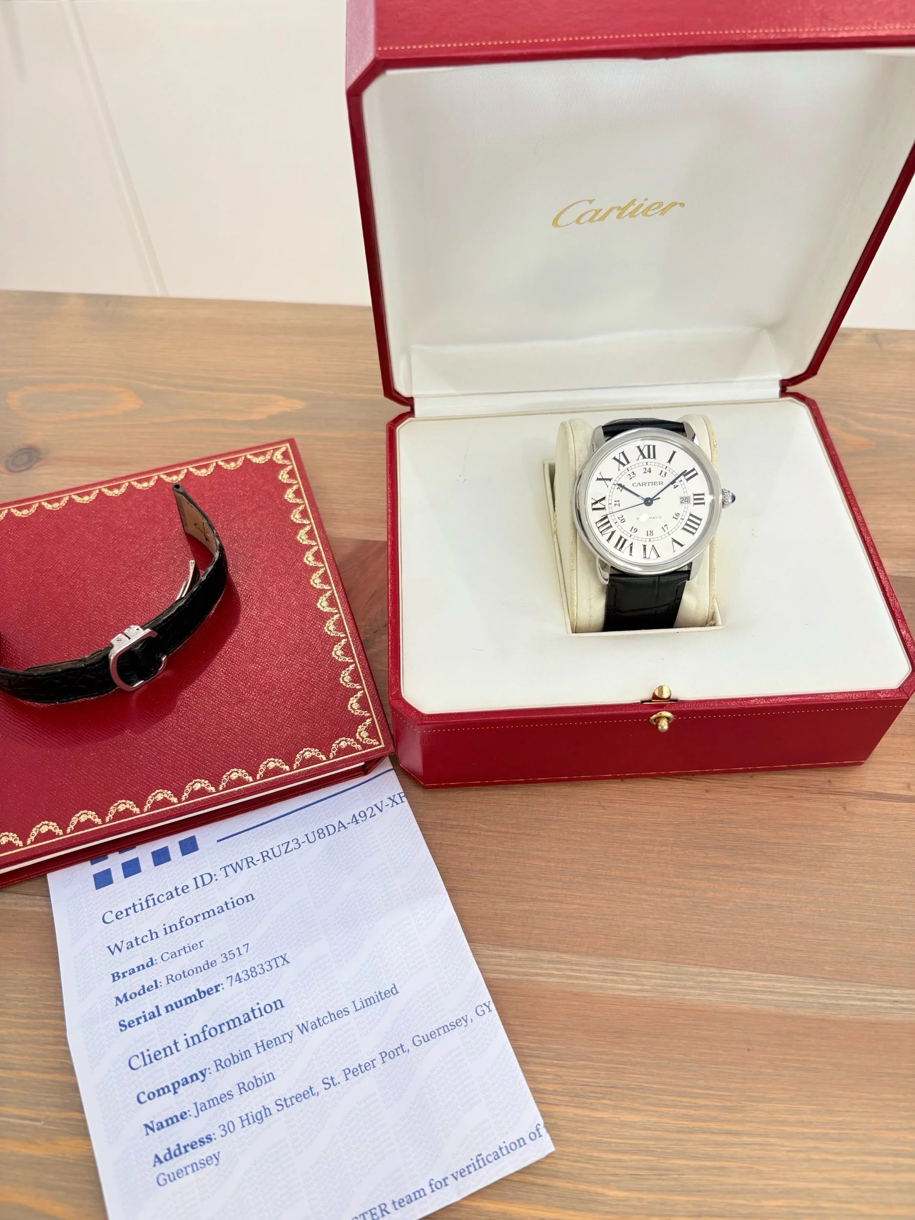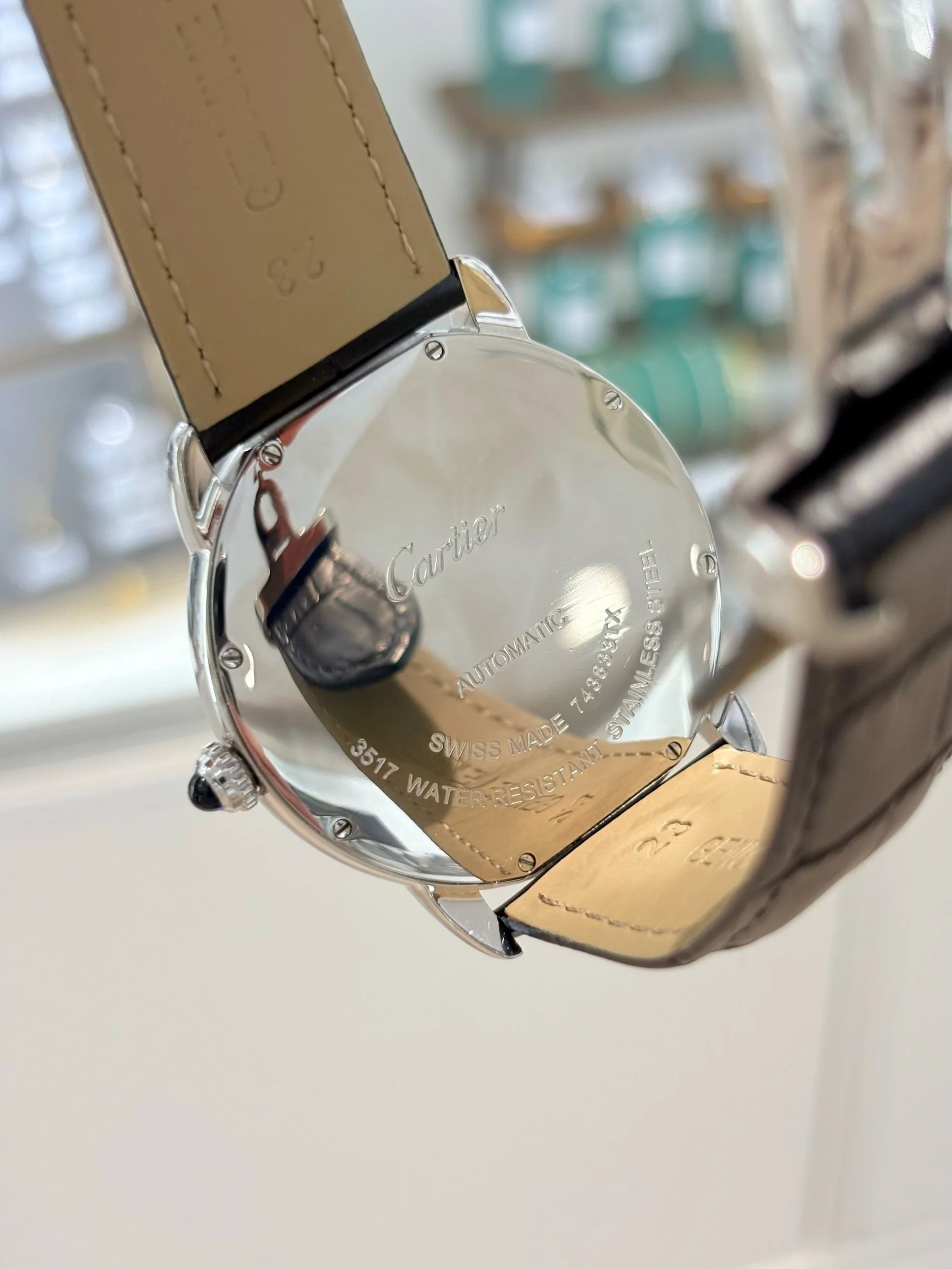 This Cartier Ronde Ref. 3517 delivers exactly that. With its elegant silvered dial, Roman numerals, railway minute track and blued sword hands, it captures the essence of Cartier design without excess. In a confident 42mm case, it offers strong wrist presence while maintaining traditional dress watch proportions.