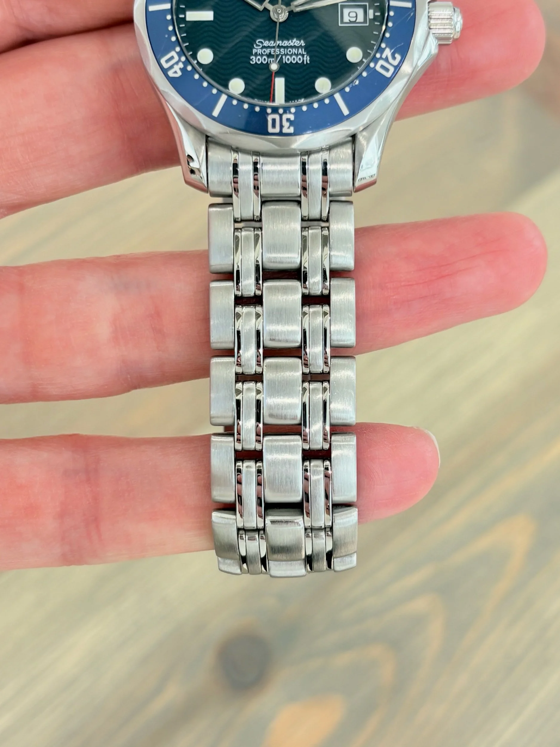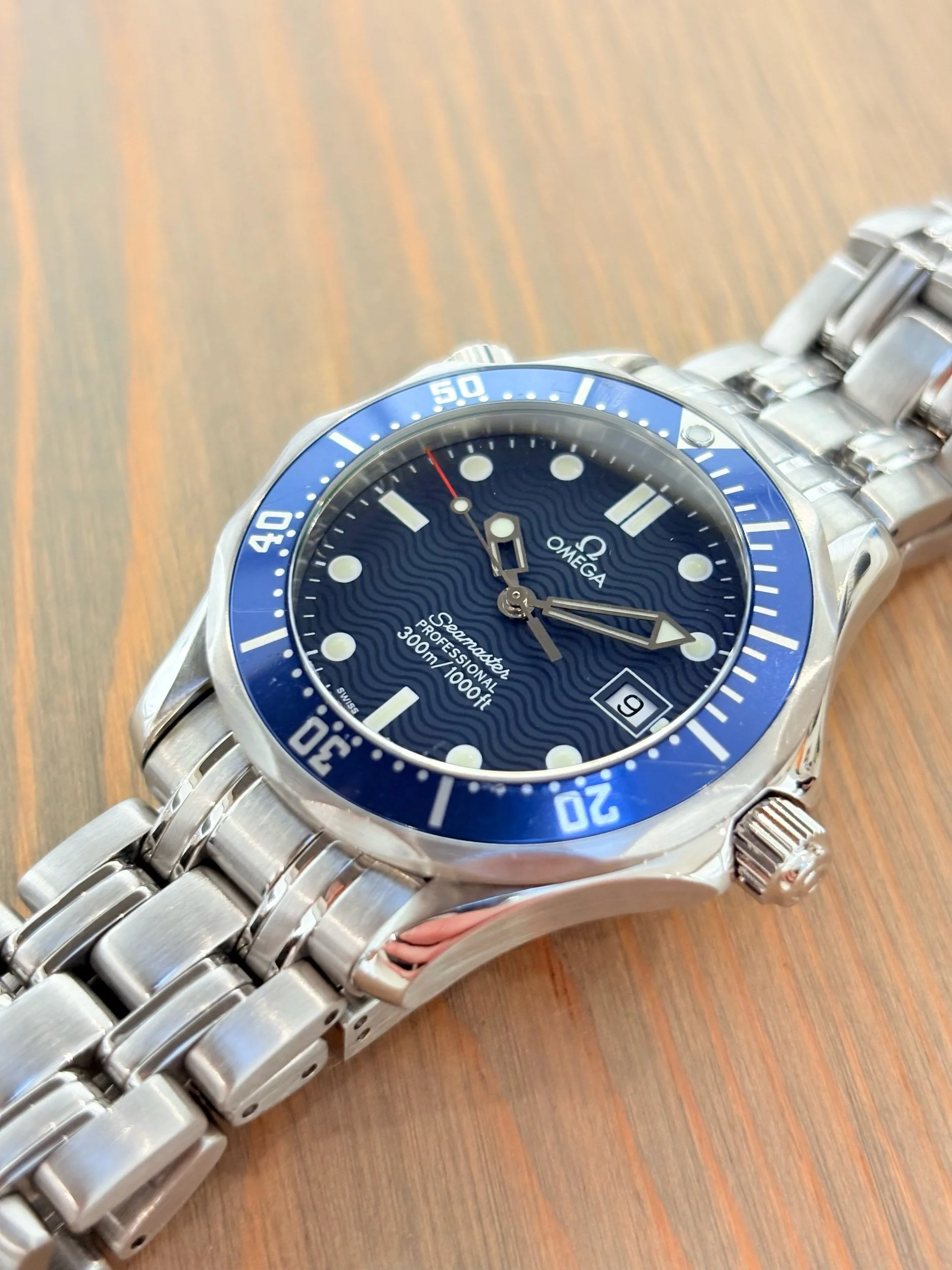 The Omega Seamaster 300M is one of the most recognisable dive watches in the world — a perfect marriage of technical excellence and timeless style. Originally introduced in the 1990s, it became a modern icon through its association with James Bond, worn by Pierce Brosnan in GoldenEye and subsequent 007 films. The reference 2561.80.00, with its 36mm case, captures all the design DNA of the full-size model in a more compact, versatile form — ideal for everyday wear without losing any of the Seamaster’s professional heritage.