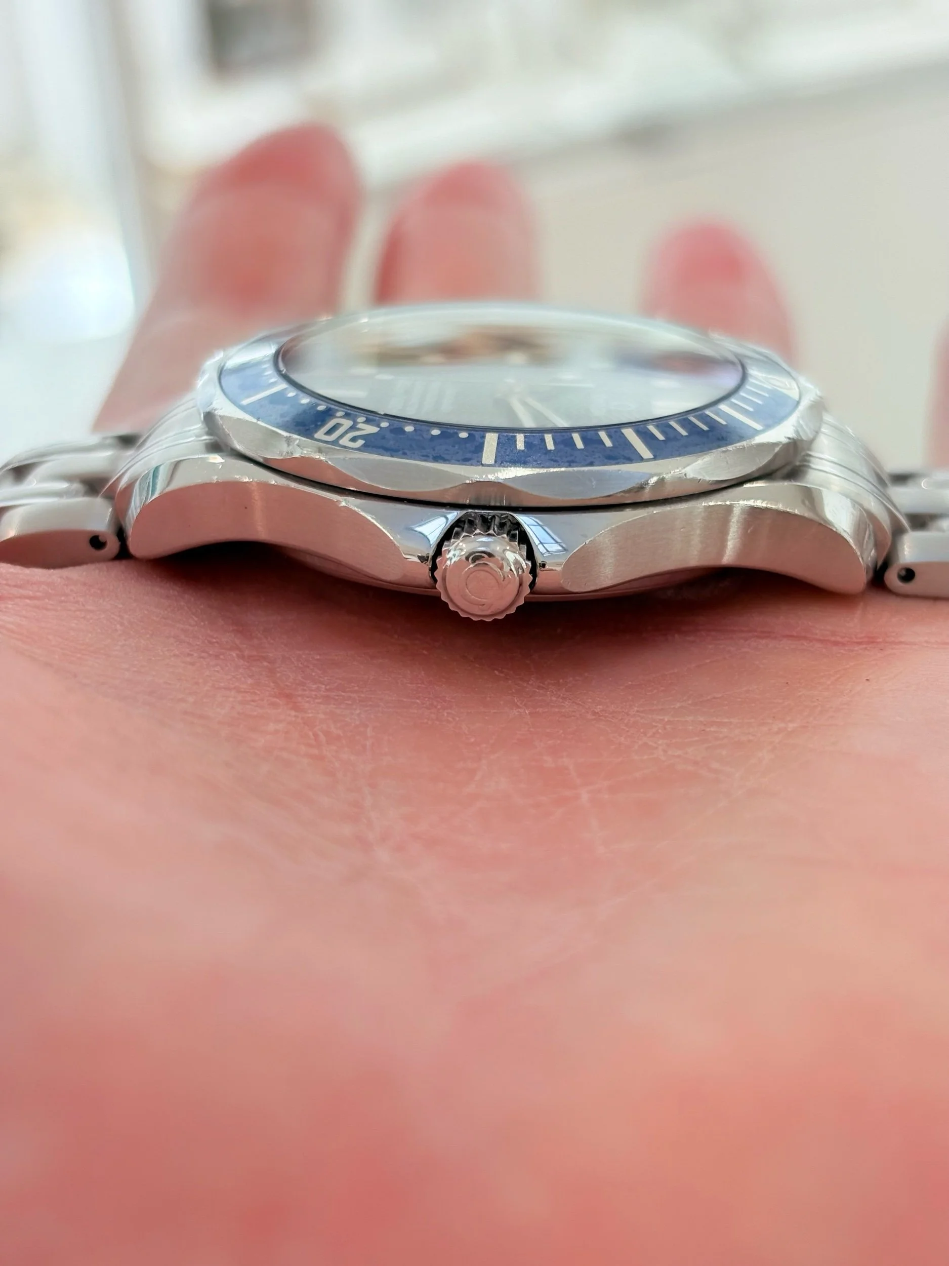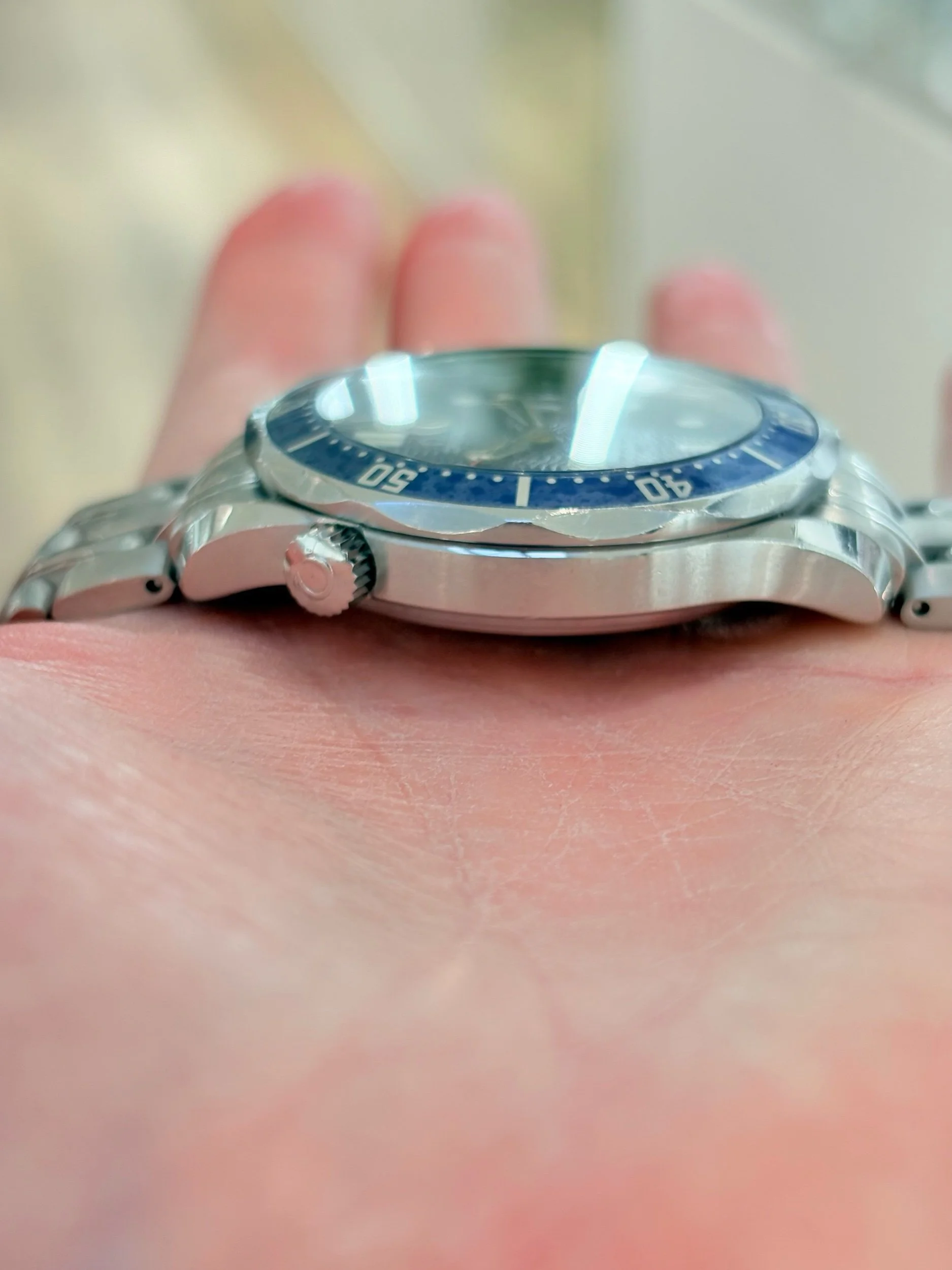 • Professional Diver’s Specification: 300m water resistance, screw-down crown, and helium escape valve — true to Omega’s tool-watch ethos.