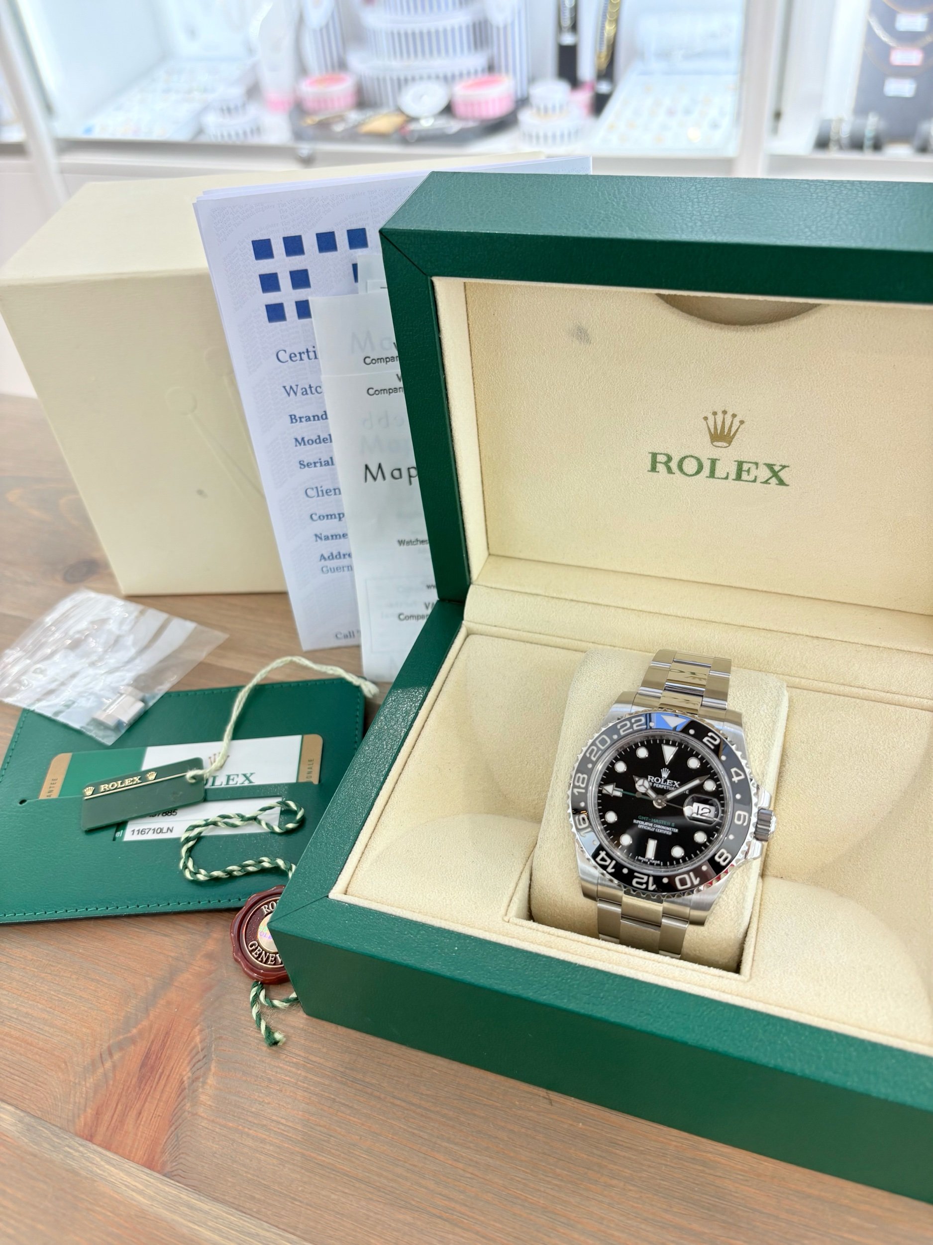 For £8,950, this Rolex GMT-Master II Ref. 116710LN offers a rare combination of discontinued status, Rolex service, and unworn condition—a standout example of a modern classic.